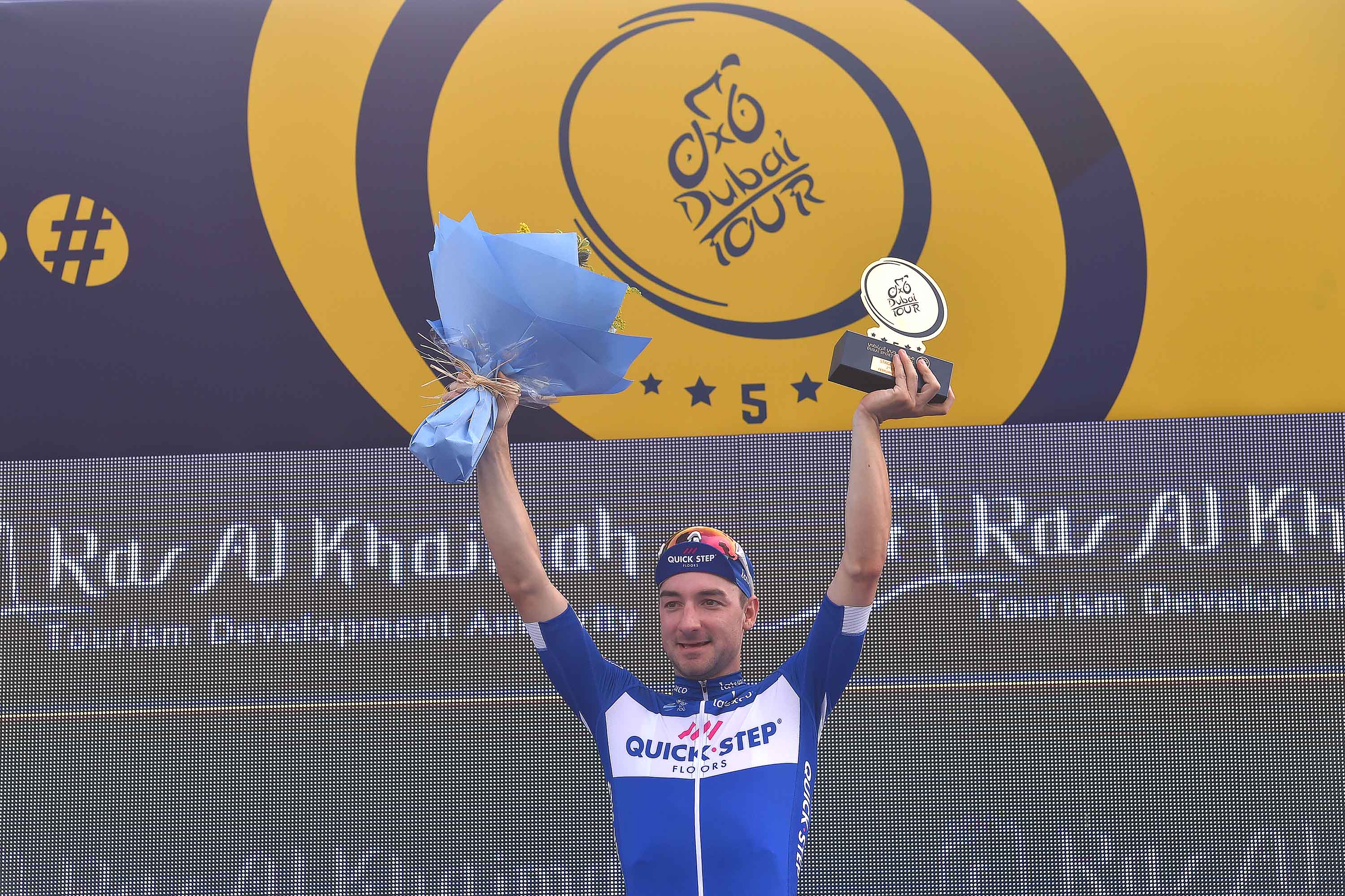 Elia Viviani couldn't have asked for a better present on the day he turned 29, as the Quick-Step Floors rider combined physical presence, positioning, timing and speed – after a flawless display of his teammates – and sailed to his second victory of the season in Ras al Khaimah, holding off the late surge of race leader Dylan Groenewegen (LottoNL-Jumbo) and countryman Riccardo Minali (Astana).
