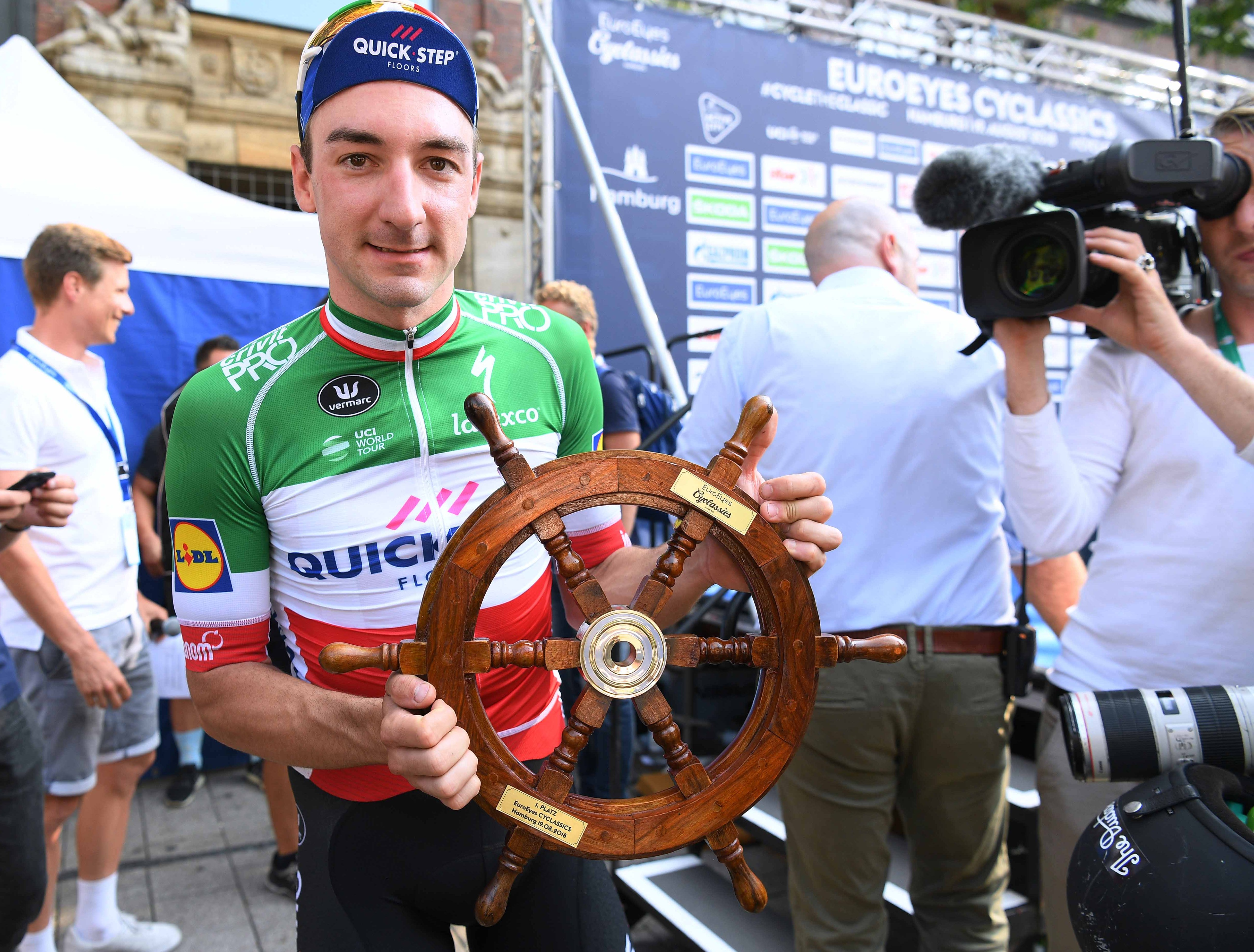 Elia Viviani took his first success in the national champion jersey, which he conquered in Darfo Boario, seven weeks ago, at the 23rd EuroEyes Cyclassics Hamburg, where he became just the second rider in history to win the one-day race twice. Just like in 2017, Viviani outsprinted Arnaud Demare (Groupama-FDJ) after jumping from the Frenchman's wheel where he was left following a long and impressive lead out of a strong Quick-Step Floors delegation consisting of Michael Mørkøv and Fabio Sabatini, in a hectic finale disrupted by a crash occurred with 1500 meters to go.