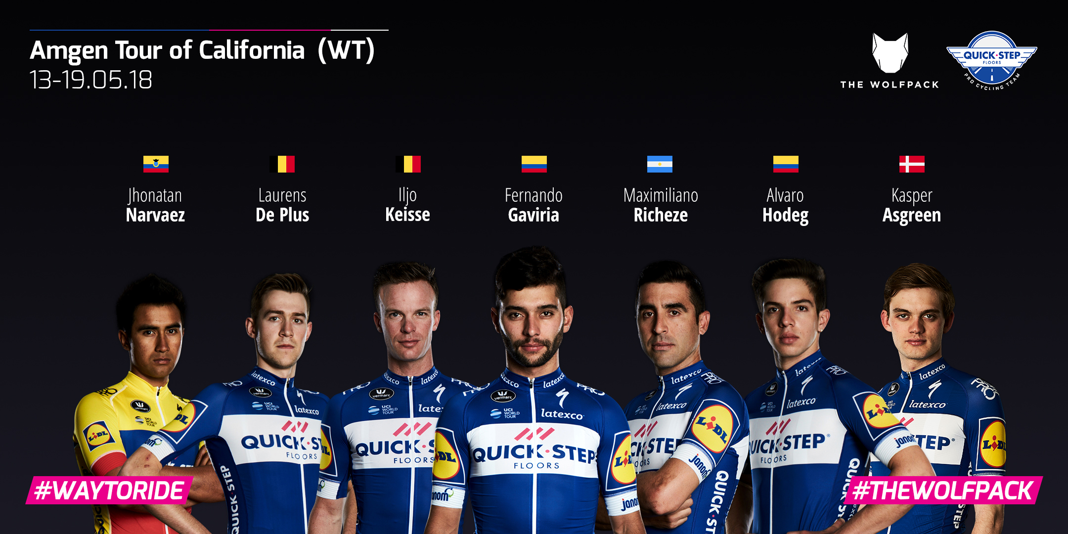 Fernando Gaviria won dit jaar al vier keer en maakt zijn Tour of California debuut. Hij krijgt een sterke Quick-Step Floors formatie achter zich met Kasper Asgreen, Alvaro Hodeg, Jhonatan Narvaez, Laurens De Plus, Iljo Keisse en Maximiliano Richeze.